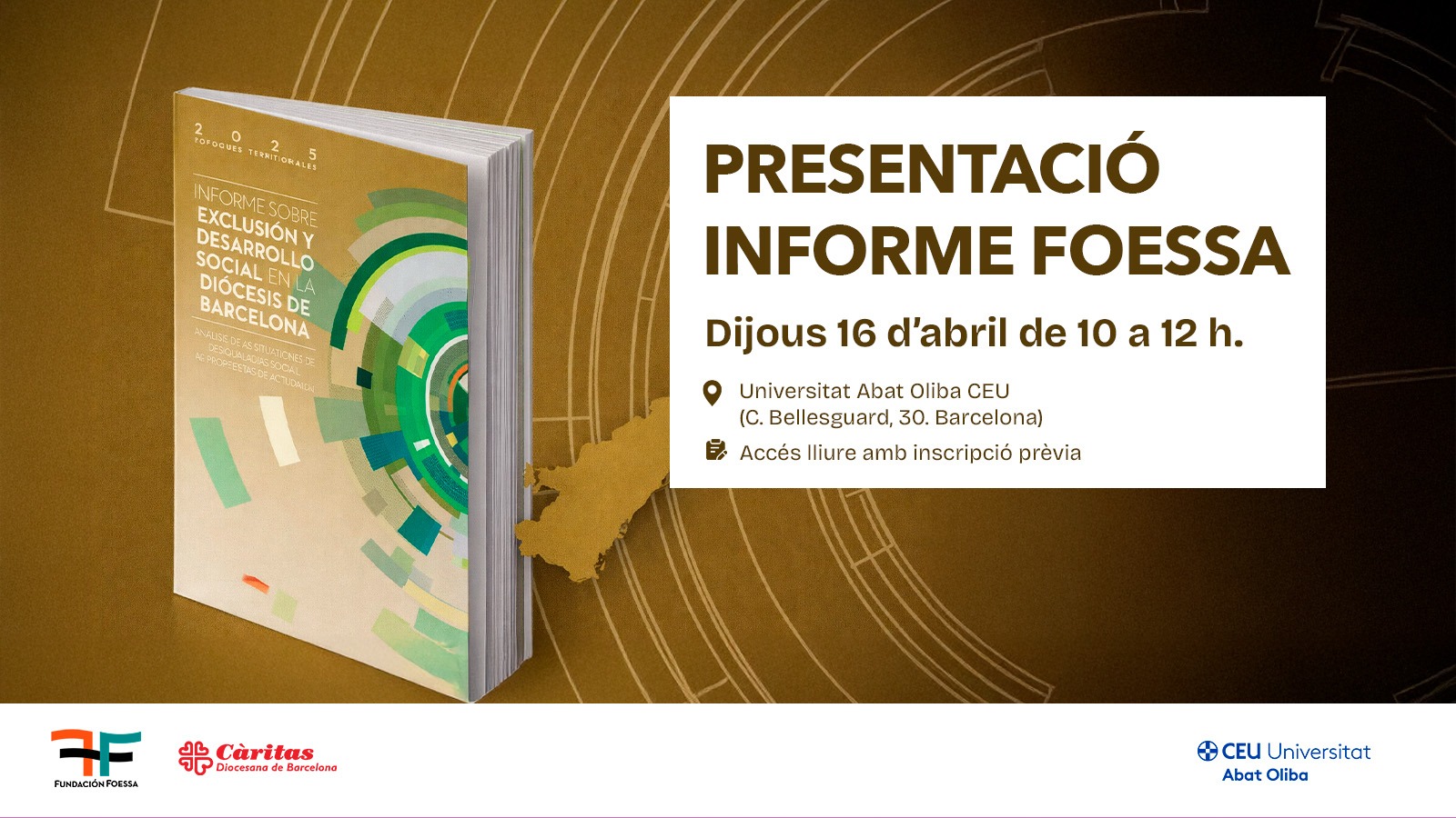 Et convidem a l’acte de presentació de l’Informe Foessa Barcelona impulsat per Càritas Diocesana de Barcelona en col·laboració amb la Universitat Abat Oliva. Aquest estudi analitza de forma rigorosa i multidimensional les condicions de vida de la població, identificant els factors que generen exclusió i les palanques necessàries per a la transformació social.